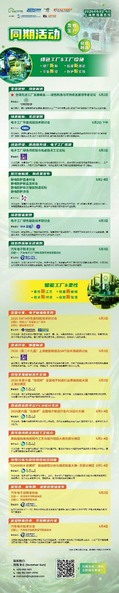为响应工信部、国家发改委、生态环境部等部门发布的绿色标准,顺应先进制造及绿色低碳转型趋势,本次Fac Tec China 电子工厂设施展联合同期NEPCON China中国电子生产设备暨微电子工业展与S-Factory Expo智能工厂与自动化技术展呈现多场行业会议,助力企业抢抓转型新机、整合优质资源实现生产工艺升级突破: